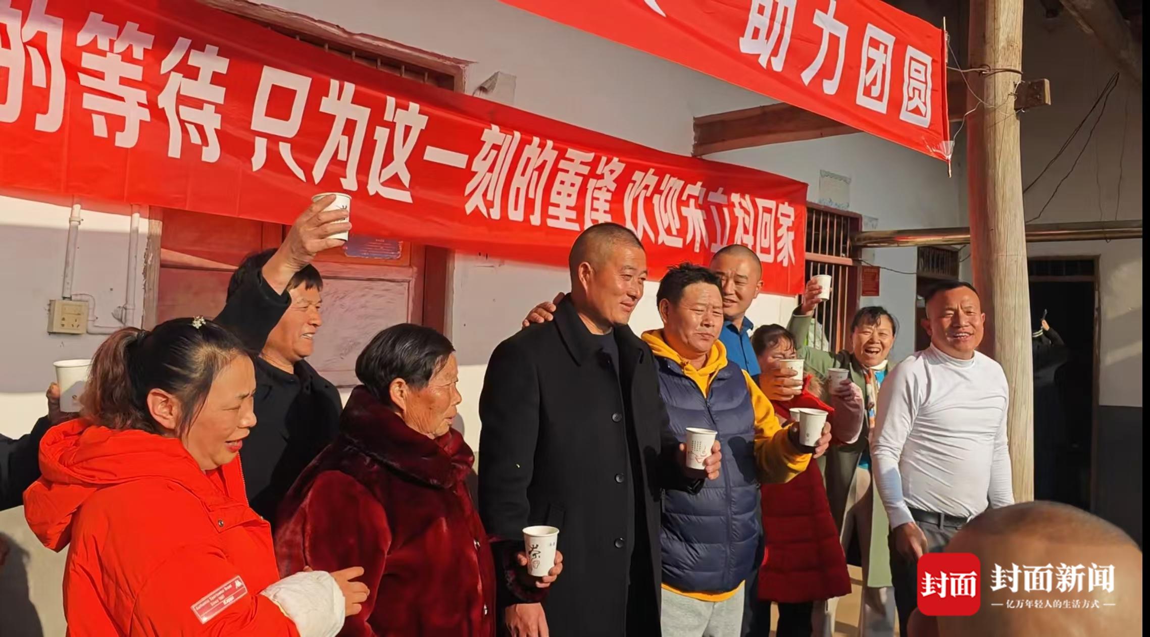 老屋瓦房的屋檐下横幅高悬:龙泉镇严颜寺村欢迎村民张国正回家!乡亲聚院同庆团圆。
