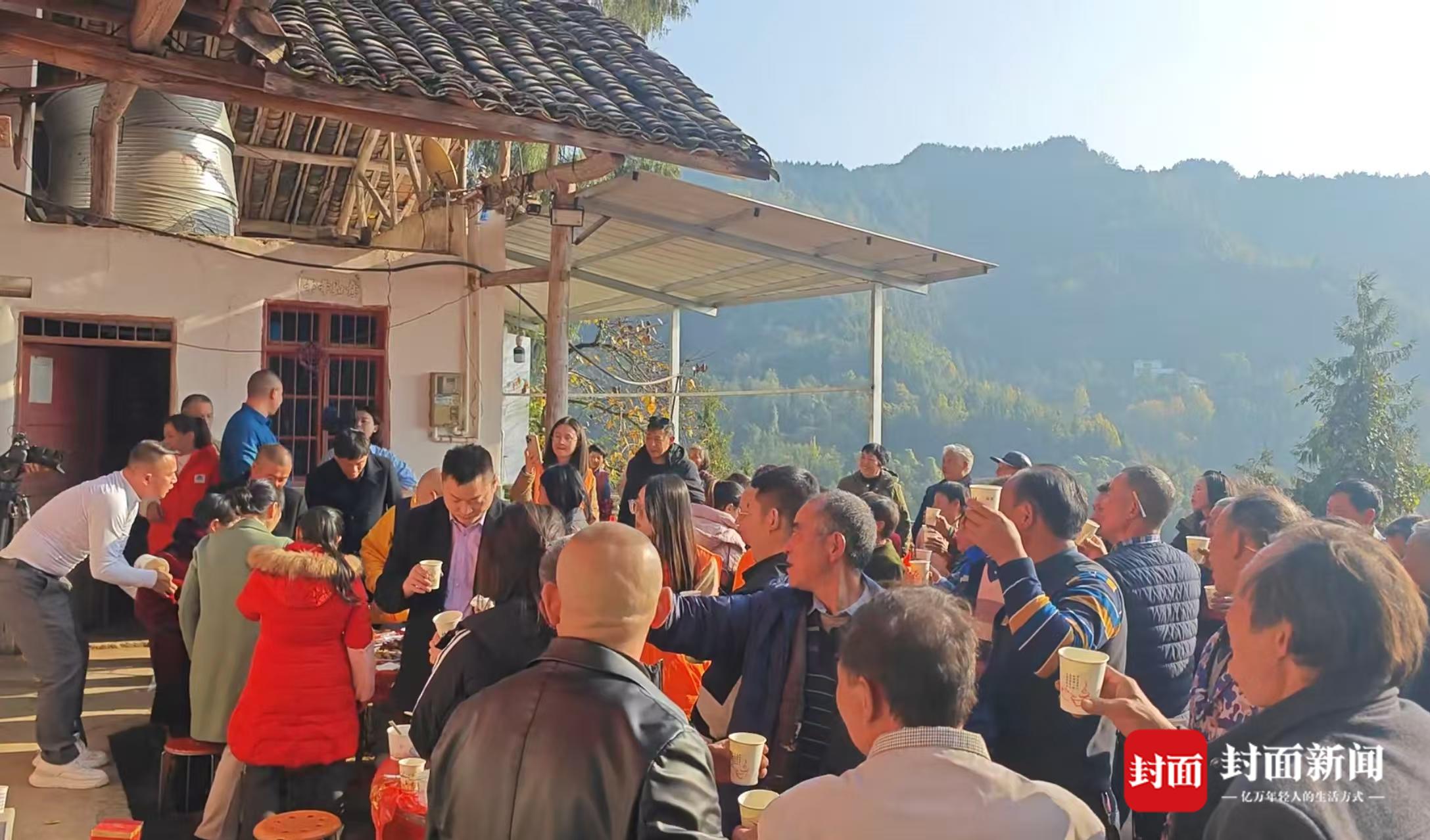 下午4时,阳光正好,村子热闹起来。庞桂芳大儿的院坝里,11桌坝坝宴开席了,这是她用当地最朴素的方式答谢所有的好心人。原计划8桌,因人员增多又加3桌,院坝里挤得满满的。