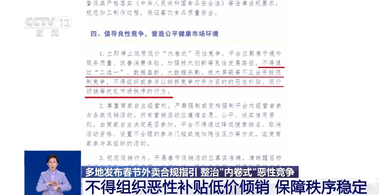 春节前夕,全国多地市监部门发布春节外卖合规指引,告诫相关外卖平台理性竞争。其中,河南信阳市和南阳市、安徽蚌埠市、广东汕头市、海南文昌市、辽宁辽阳市等地要求,外卖平台立即停止低质低价“内卷式”恶性竞争,不得组织恶性补贴、低价倾销,以保障春节外卖市场秩序稳定。